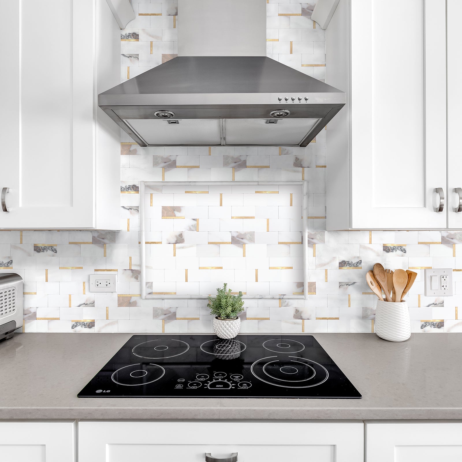 3" x 6" White With Gold Peel and Stick Backsplash Brick Subway Tile