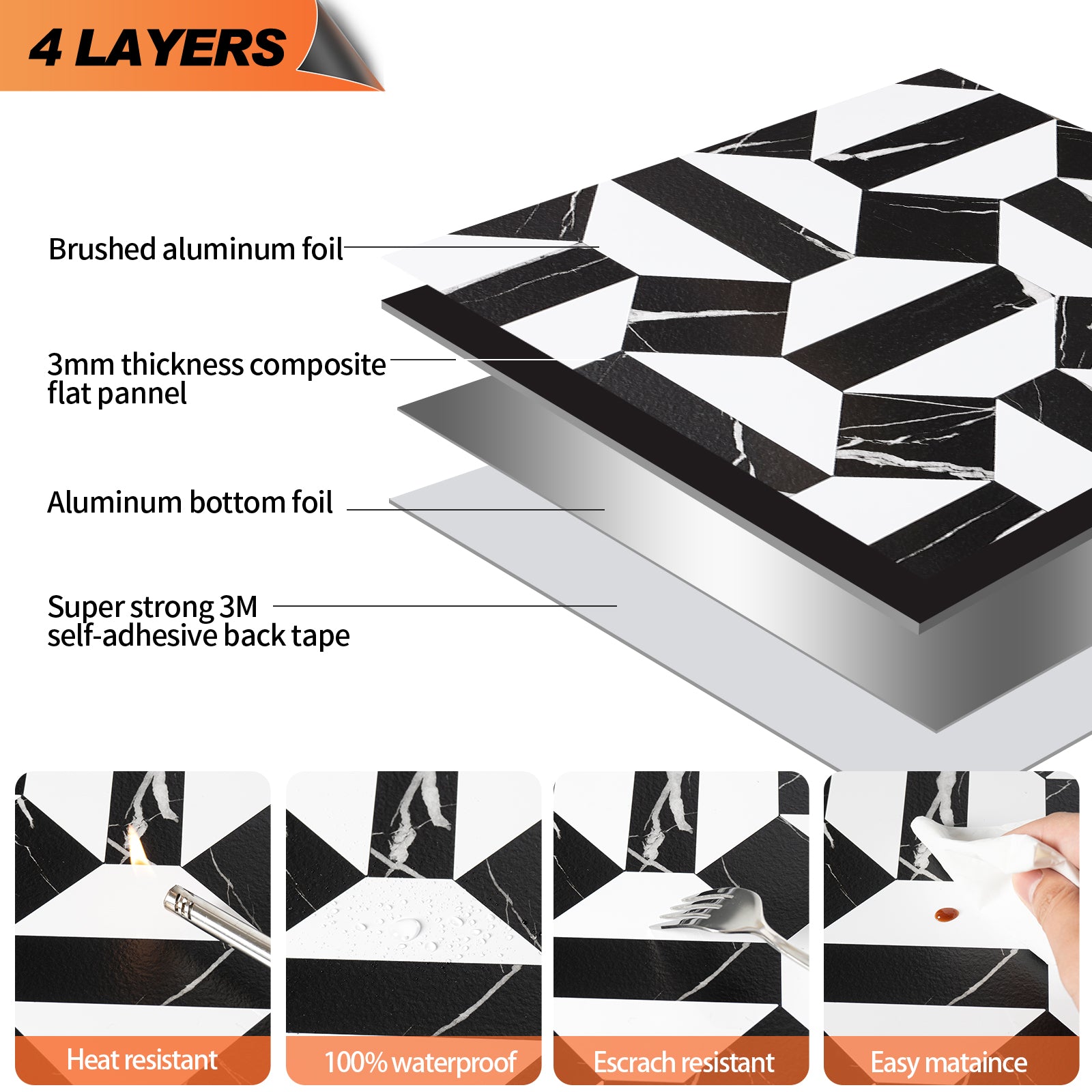 It has a thickness of 4mm, is resistant to heat and humidity, and is widely used in home décor such as kitchen island walls, bathroom backsplash, bedroom walls, laundry room, Washbasin, fireplace, etc.