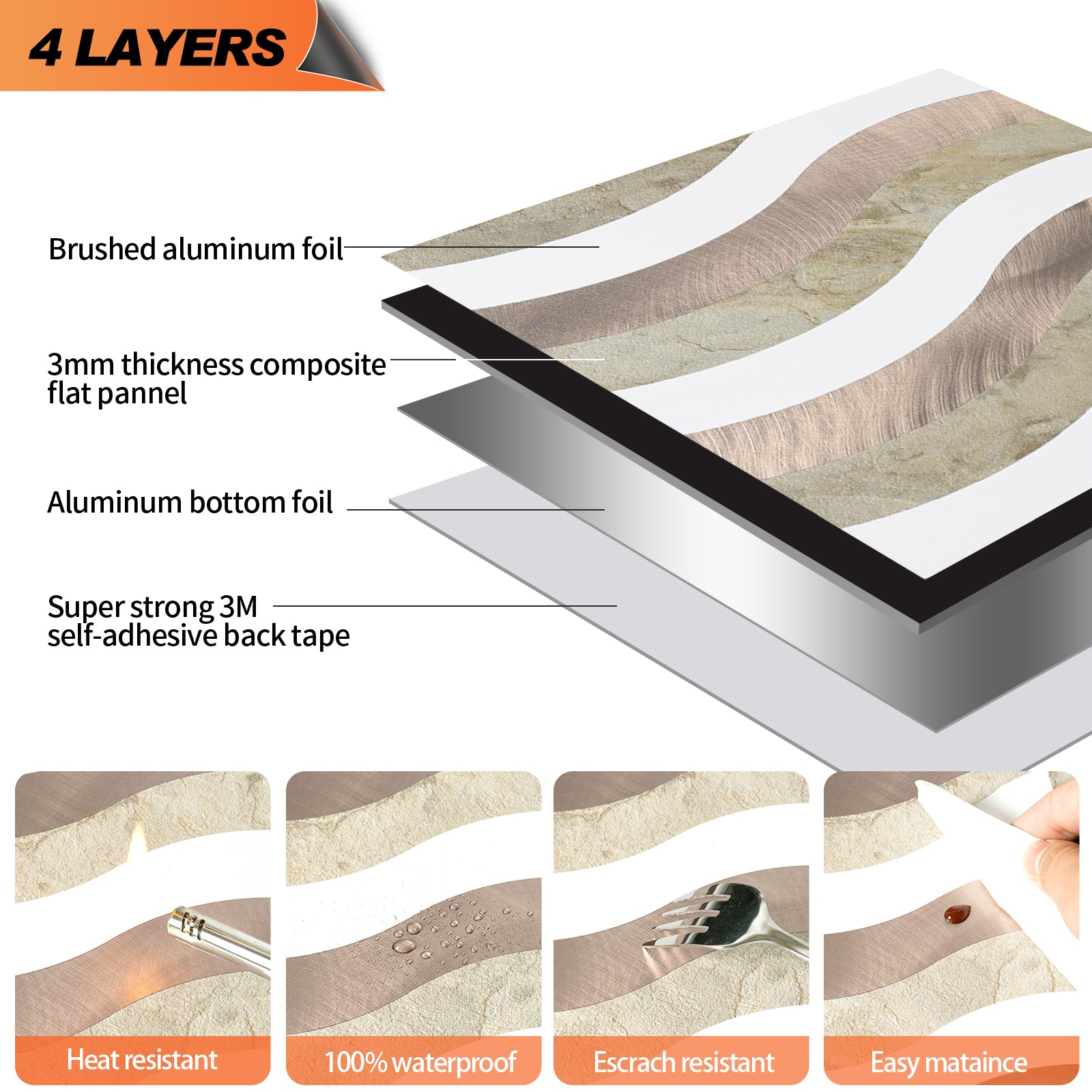 It has a thickness of 4mm, is resistant to heat and humidity, and is widely used in home décor such as kitchen island walls, bathroom backsplash, bedroom walls, laundry room, Washbasin, fireplace, etc.